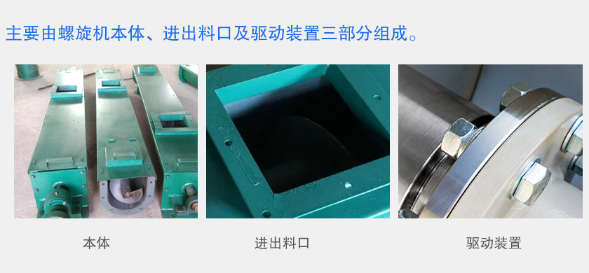 粉末螺旋輸送機(jī)主要由螺旋機(jī)本體、進(jìn)出料口及驅(qū)動裝置三部分組成。