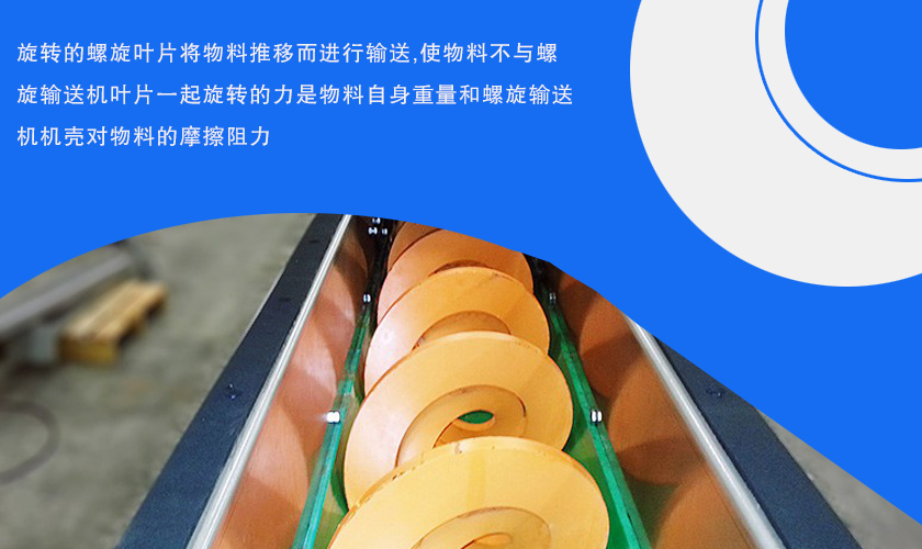 當(dāng)螺旋軸轉(zhuǎn)動時,由于物料的重力及其與槽體壁所產(chǎn)生的摩擦力,使物料只能在葉片的推送下沿著輸送機(jī)的槽底向前移動,其情況好像不能旋轉(zhuǎn)的螺母沿著旋轉(zhuǎn)的螺桿作平移運動一樣。物料在中間軸承的運移,則是依靠后面前進(jìn)著的物料的推力。所以,物料在輸送機(jī)中的運送,完全是一種滑移運動。為了使螺旋軸處于較為有利的受拉狀態(tài),一般都將驅(qū)動裝置和卸料口安放在輸送機(jī)的同一端,而把進(jìn)料口盡量放在另一端的尾部附近。 旋轉(zhuǎn)的螺旋葉片將物料推移而進(jìn)行輸送,使物料不與螺旋輸送機(jī)葉片一起旋轉(zhuǎn)的力是物料自身重量和螺旋輸送機(jī)機(jī)殼對物料的摩擦阻力。葉片的面型根據(jù)輸送物料的不同有實體面型、帶式面型、葉片面型等型式。螺旋輸送機(jī)的螺旋軸在物料運動方向的終端有止推軸承以隨物料給螺旋的軸向反力,在機(jī)長較長時,應(yīng)加中間吊掛軸承。