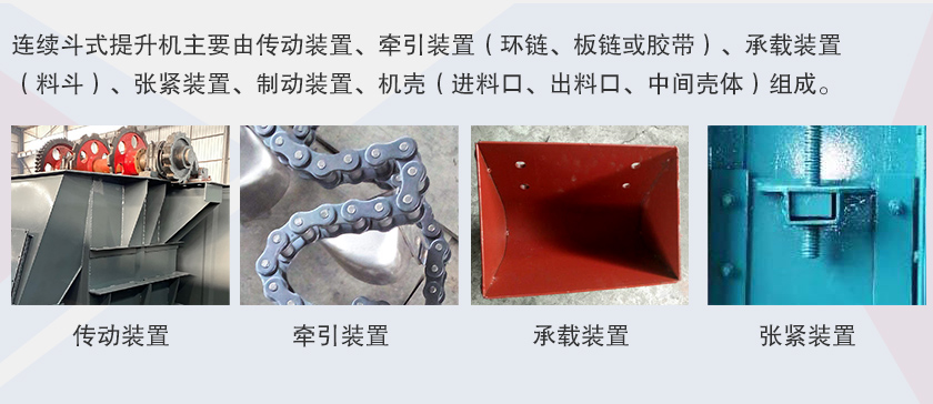 連續(xù)斗式提升機(jī)主要由傳動(dòng)裝置、牽引裝置(環(huán)鏈、板鏈或膠帶)、承載裝置(料斗)、張緊裝置、制動(dòng)裝置、機(jī)殼(進(jìn)料口、出料口、中間殼體)組成。