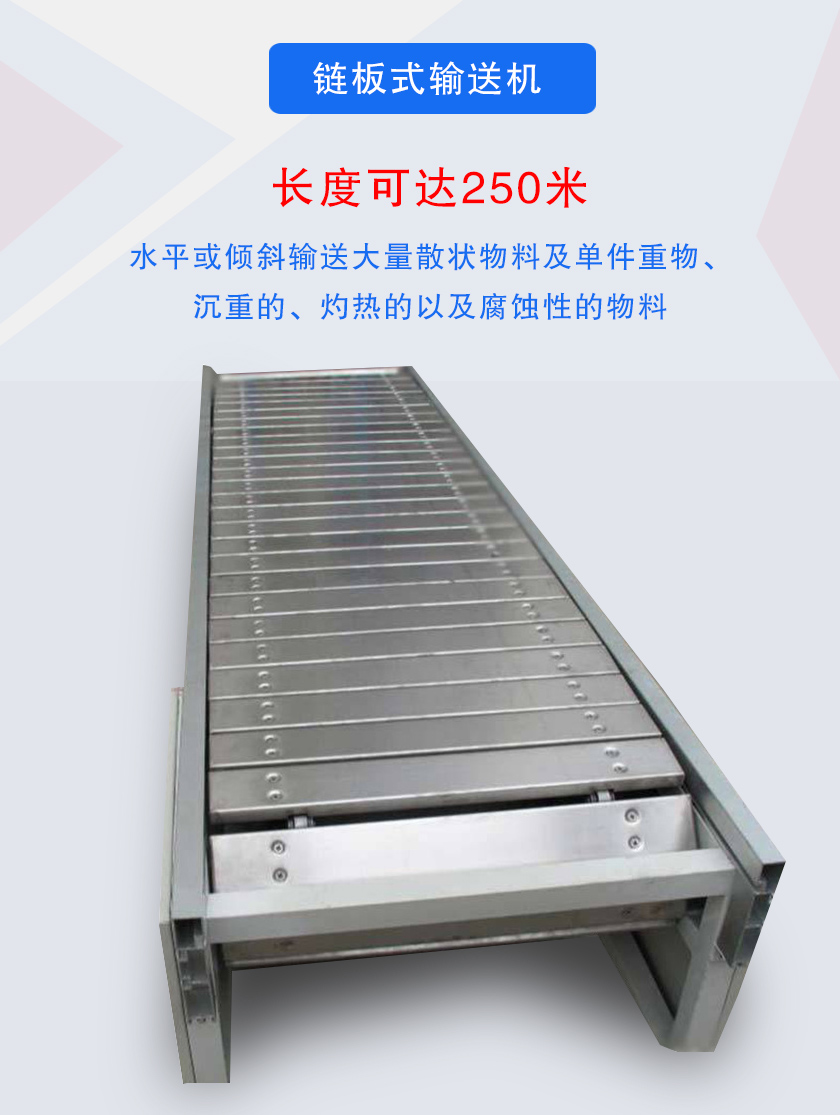 鏈板式輸送機是利用固接在牽引鏈上的一系列鏈條提供牽引力,用金屬板做為承載體使物料在水平或傾斜方向上輸送。