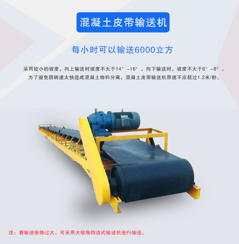 混凝土皮帶輸送機(jī)主要用于一般的中大型混凝土攪拌站中,在一套完整的混凝土攪拌站中,混凝土攪拌機(jī)、混凝土配料機(jī)、上料機(jī)、水泥罐等都會使用到皮帶輸送機(jī)進(jìn)行物料的輸送,針對不同的現(xiàn)場情況,混凝土皮帶輸送機(jī)可采用不同的設(shè)計(jì),其輸送線呈成水平、傾斜或水平、垂直方向上彎曲布置,因受地形條件限制較小,斜坡道運(yùn)輸時(shí),應(yīng)采用較小的坡度,向上輸送時(shí)坡度不大于14°-16°,向下輸送時(shí),坡度不大于6°-8°。為了避免因轉(zhuǎn)速太快造成混凝土物料分離,混凝土皮帶輸送機(jī)帶速不應(yīng)超過1.2米/秒。