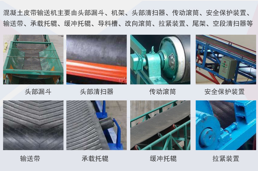 混凝土皮帶輸送機(jī)主要由頭部漏斗、機(jī)架、頭部清掃器、傳動(dòng)滾筒、安全保護(hù)裝置、輸送帶、承載托輥、緩沖托輥、導(dǎo)料槽、改向滾筒、拉緊裝置、尾架、空段清掃器等部分組成。