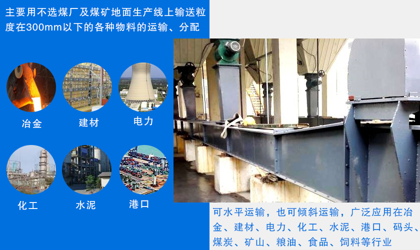 刮板鏈?zhǔn)捷斔蜋C(jī)主要用不選煤廠及煤礦地面生產(chǎn)線上輸送粒度在300mm以下的各種物料的運(yùn)輸、分配??伤竭\(yùn)輸,也可傾斜運(yùn)輸,廣泛應(yīng)用在冶金、建材、電力、化工、水泥、港口、碼頭、煤炭、礦山、糧油、食品、飼料等行業(yè)。