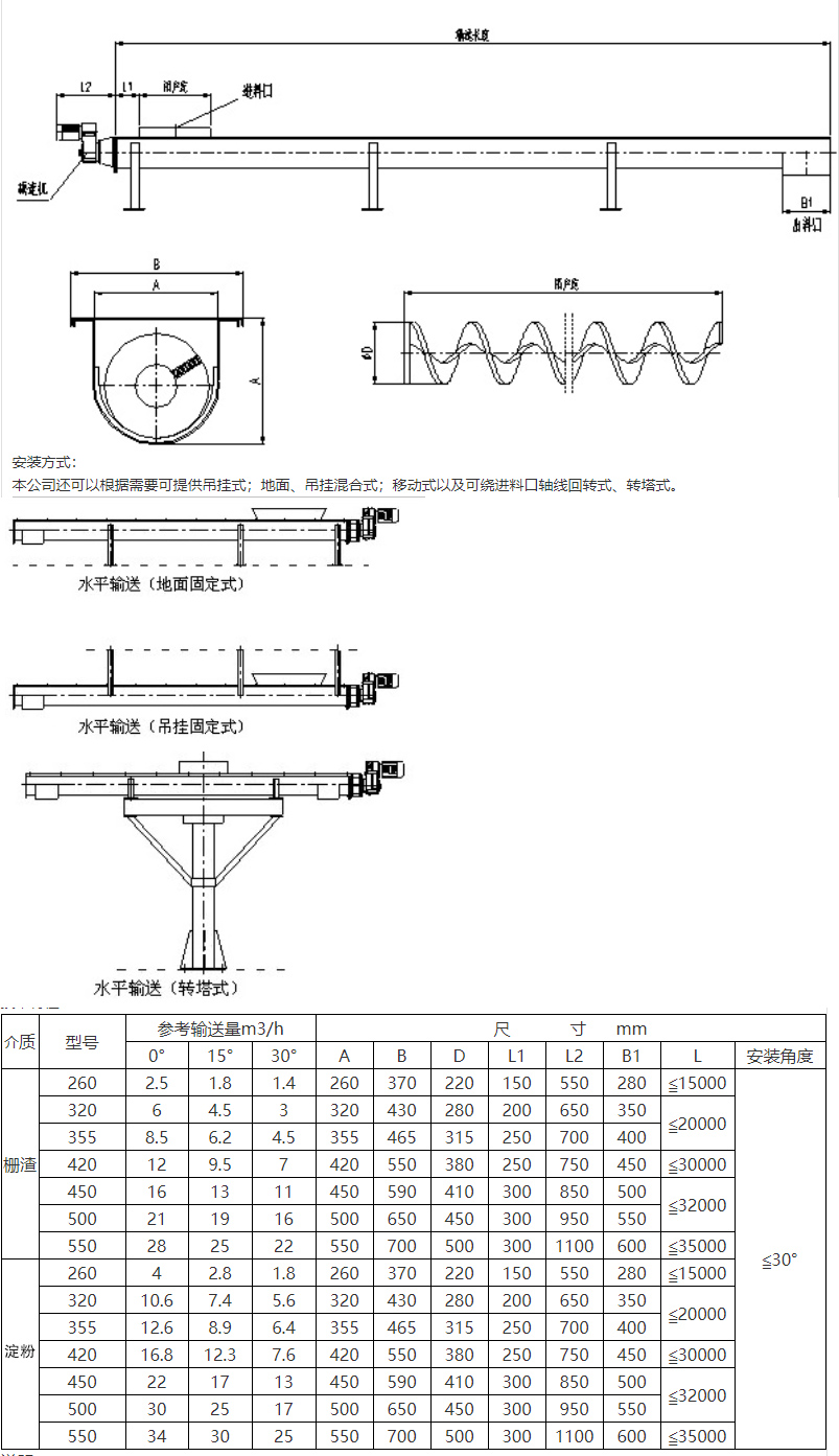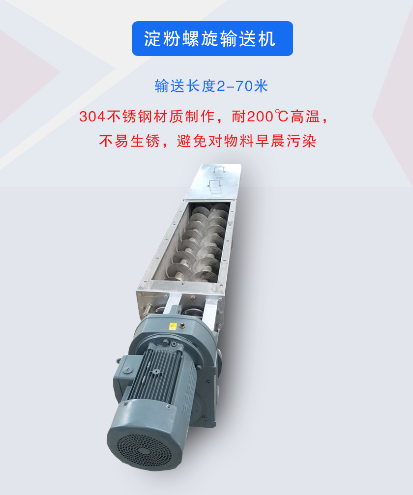 淀粉螺旋輸送機(jī)主要由驅(qū)動(dòng)裝置、螺旋、頭節(jié)、中間節(jié)、尾節(jié)、進(jìn)、出料裝置等組成。