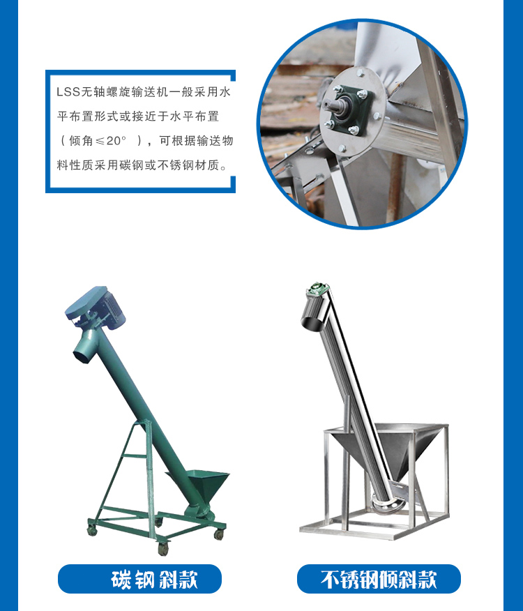 1、LSS無(wú)軸螺旋輸送機(jī)采用無(wú)中心軸設(shè)計(jì),抗纏繞性強(qiáng)。
