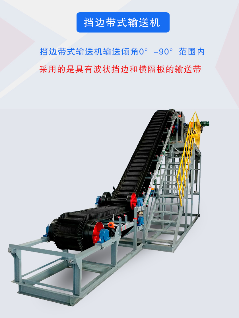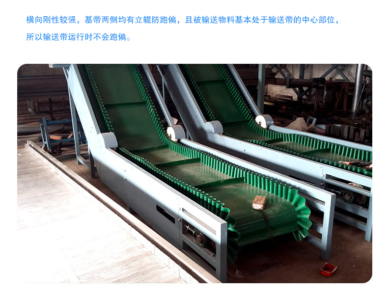 1、波狀擋邊輸送帶和橫隔板設(shè)計(jì),可以防止物料在輸送過(guò)程中散落或下滑。