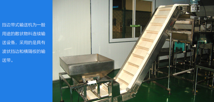 擋邊帶式輸送機(jī)具有波狀擋邊和橫隔離板的輸送帶,適用于大傾角連續(xù)輸送散裝物料,擋邊帶式輸送機(jī)的輸送帶兩則有波狀紋的擋邊,皮帶中間部位有橫隔板,在輸送物料的過(guò)程中不容易撒料和下滑,適用于大傾角連續(xù)輸送散狀物料。