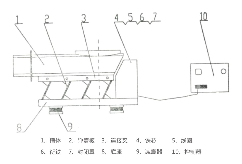 DZGL-512型振動給料機整體結(jié)構(gòu)簡潔緊湊,主要由槽體、激振源、減震系統(tǒng)和機架四部分組成。整體布局合理,運行可靠,便于安裝與后期維護。