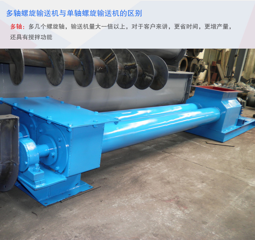 多軸螺旋輸送機(jī)與單軸螺旋輸送機(jī)相比多幾個螺旋軸,輸送機(jī)量大一倍以上,對于客戶來講,更省時間,更增產(chǎn)量,還具有攪拌功能,單軸螺旋輸送機(jī)無論向哪個方向運(yùn)轉(zhuǎn),都不具體混合攪拌的功能,而多軸螺旋輸送機(jī)則是兩邊螺旋軸轉(zhuǎn)向不同的方向(注:都向內(nèi)側(cè)轉(zhuǎn)動)。所以當(dāng)物料放入進(jìn)料口時,會自動將物料轉(zhuǎn)動到中間,混合到一起。