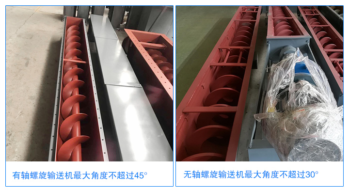 有軸螺旋輸送機(jī)角度不超過45°,有軸螺旋輸送機(jī)因機(jī)體有軸分布,輸送物料相對(duì)無軸少。