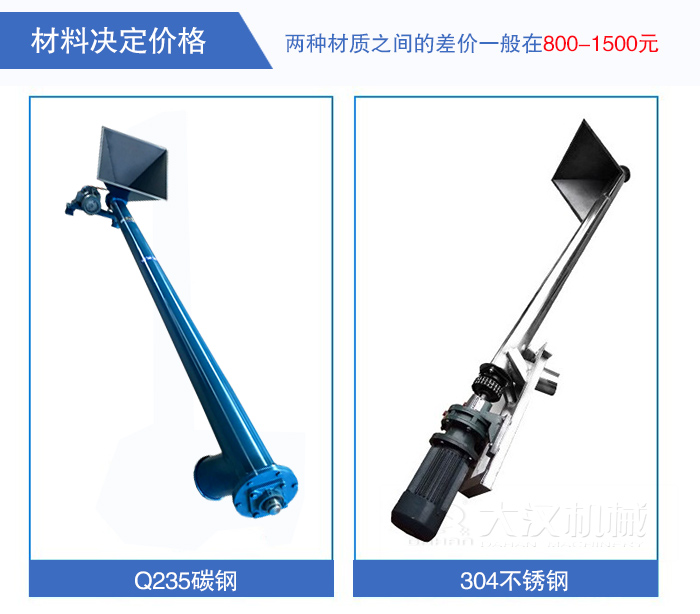 螺旋輸送機(jī)殼體有Q235碳鋼,304不銹鋼,這兩個(gè)之間的差價(jià)一般在800-1500元。另外,選擇不同配件價(jià)格也會(huì)不同,舉例來說,采用普通電機(jī)的輸送機(jī)價(jià)格比防爆電機(jī)的輸送機(jī)價(jià)格便宜,所以用戶在選擇時(shí)需要結(jié)合自身情況。