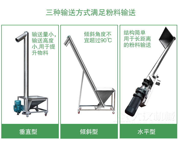 垂直型管式螺旋輸送機(jī)——輸送量小,輸送高度小,轉(zhuǎn)速較高,能耗大。特別適宜輸送流動性好的粉粒狀物料,主要用于提升物料,提升高度一般不大于8米。