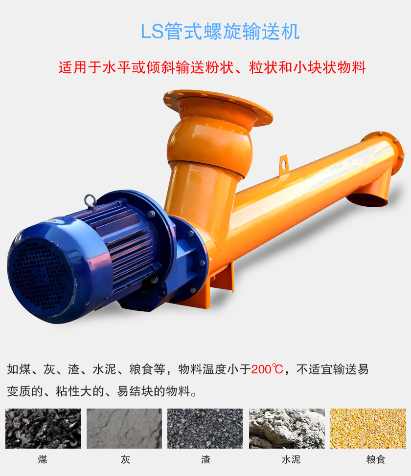 LS管式螺旋輸送機適用于水平或傾斜輸送粉狀、粒狀和小塊狀物料,如煤、灰、渣、水泥、糧食等,物料溫度小于200℃,不適宜輸送易變質(zhì)的、粘性大的、易結(jié)塊的物料。