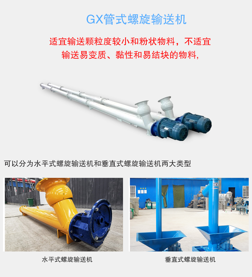 GX型管式螺旋輸送機是按照J(rèn)B/T679-95《螺旋輸送機》標(biāo)準(zhǔn)設(shè)計制造,是LS型螺旋輸送機的換代產(chǎn)品,適宜輸送顆粒度較小和粉狀物料,不適宜輸送易變質(zhì)、黏性和易結(jié)塊的物料,可以分為水平式螺旋輸送機和垂直式螺旋輸送機兩大類型。