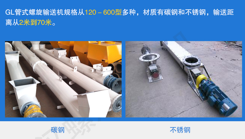 GL管式螺旋輸送機規(guī)格從120-600型多種,材質(zhì)有碳鋼和不銹鋼,輸送距離從2米到70米。