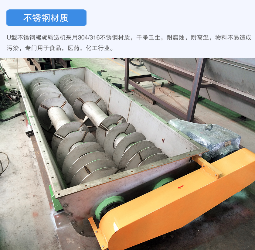 U型不銹鋼螺旋輸送機(jī)采用304/316不銹鋼材質(zhì),干凈衛(wèi)生,耐腐蝕,耐高溫,物料不易造成污染,專(zhuān)門(mén)用于食品,醫(yī)藥,化工行業(yè)。