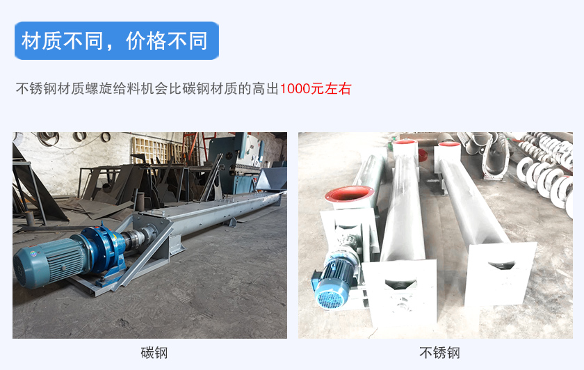 螺旋給料機可以分為碳鋼和不銹鋼材質(zhì)兩種,碳鋼螺旋給料機適合普通物料輸送,不銹鋼螺旋給料機主要用于輸送機一些腐蝕性、高溫物料,不銹鋼材質(zhì)螺旋給料機會比碳鋼材質(zhì)的高出1000元左右。